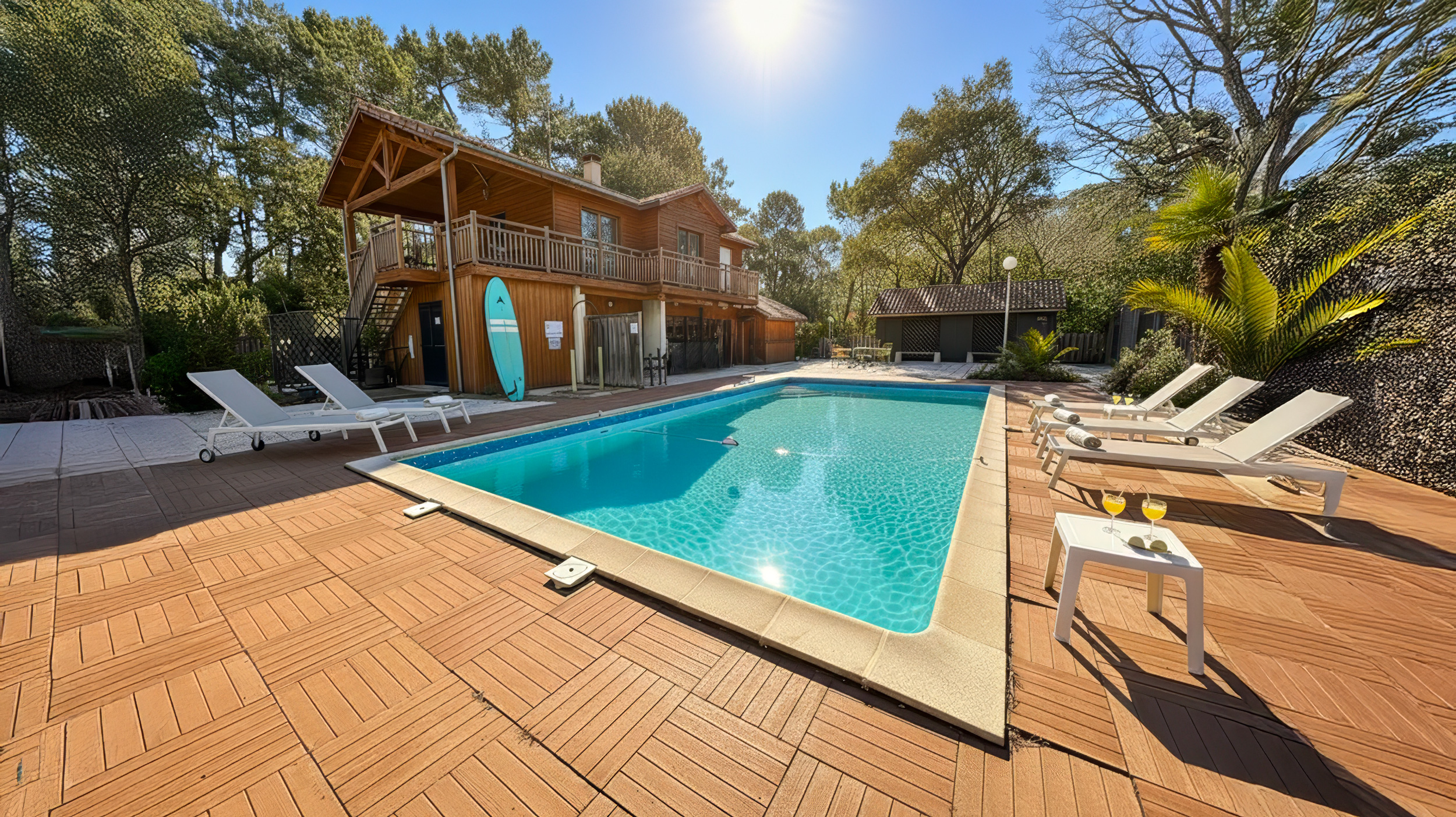 Das Surfcamp Soustons Plage ist das neue Ü18-Only Camp für alle, die im Sommer ’26 Surfen, Community und Pool-Vibes kombinieren wollen. Du wohnst strandnah in einer ruhigen Siedlung und läufst durch schattige Waldwege Richtung Atlantik: nur ca. 900 m bis zum Strand, zum Meer sind es etwa 1,3 km. Im Camp erwarten dich ein großer Pool mit Sonnenliegen, eine Poolbar zum Connecten, und Bungalows, die du teilen oder exklusiv mit deiner Crew buchen kannst. Vollverpflegung ist inklusive, vegan geht immer mit.Highlights