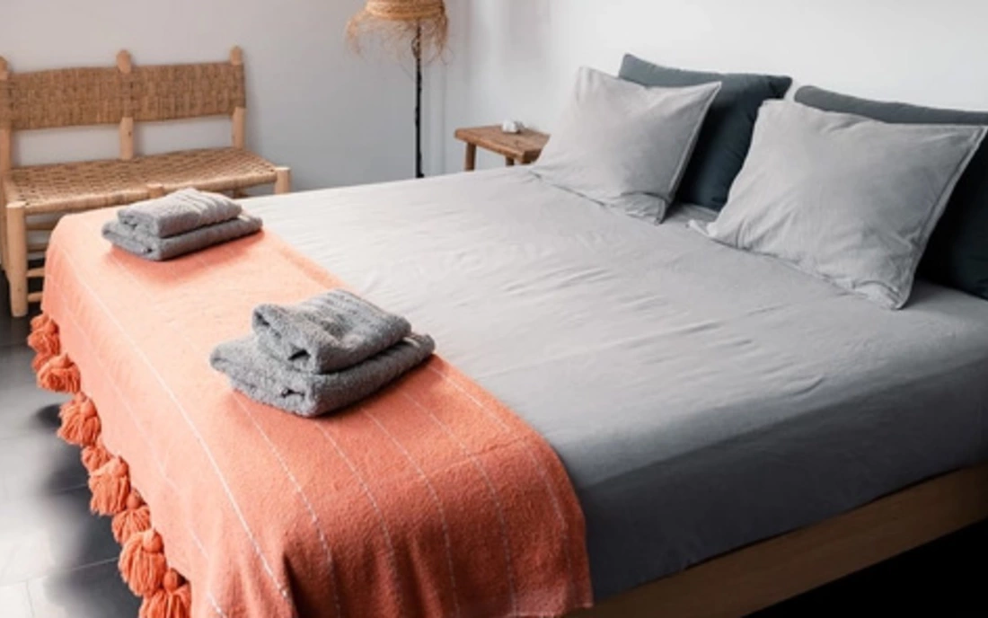 Zwei nebeneinanderliegende Doppelzimmer mit geteiltem Bad, eigenem Zugang zur Terrasse und Lage direkt am Garten oder Pool. Ideal für Familien mit ein bis zwei größeren Kindern – beide Zimmer sind getrennt, aber direkt nebeneinander gelegen.