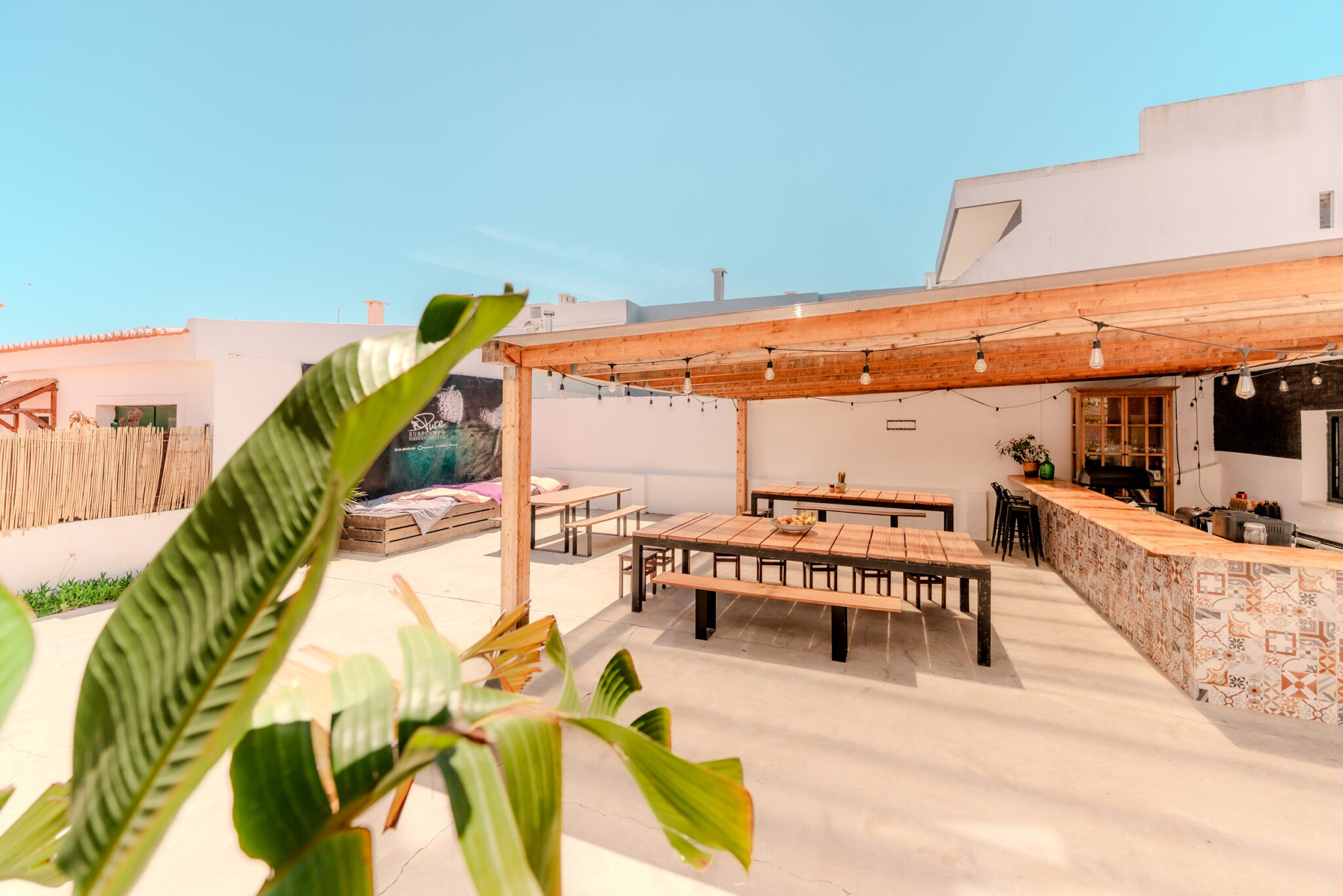 Das Haus besticht durch eine entspannte Atmosphäre, eine stylische Outdoor-Bar und gemütliche Gemeinschaftsbereiche. Abends sorgen gemeinsame Aktivitäten und leckeres Essen für unvergessliche Momente in einer motivierten Surf-Community.