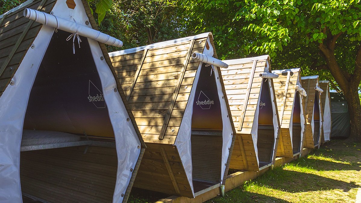 Unsere chilligen Holzkabinen für 1 bis 2 Personen. Auf Wunsch können die Sheddie Deluxe mit 2 Einzelbetten oder einem Doppelbett ausgestattet werden. Die Deluxe Variante der Sheddies ist größer als die normale Version, bietet mehr Stauraum und Ablagefläche. Werden 2 Einzelbetten bestellt, so bleibt auch ein Durchgang zwischen den Betten frei. Bei einer Raumhöhe von 2 m könnt ihr aufrecht stehen.